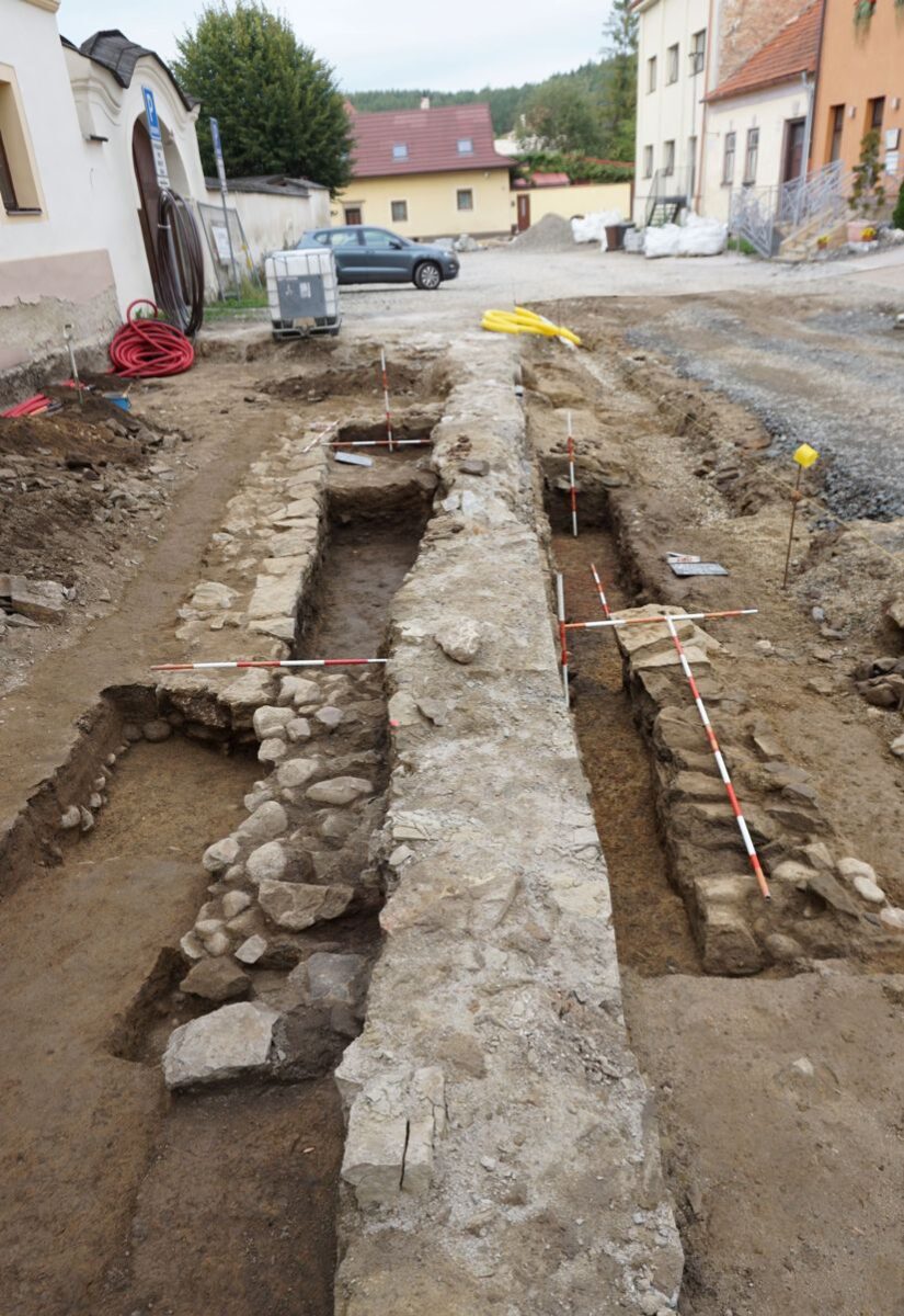 Boli tu zvyšky kamenných múrov z rôznych období. Ich datovanie vyžaduje podrobnejší archívny výskum. Z archeologického hľadiska je to sťažené tým, že úpravy chodníka v 20. storočí viedli k odstráneniu novovekých vrstiev, počas výskumu sme sa pohybovali v úrovni základov murív, ktoré boli založené vo vrstve obsahujúcej materiál z 2. polovice 15. storočia. Väčšinu z nich však nemožno datovať do stredoveku.