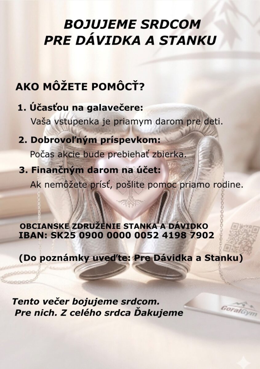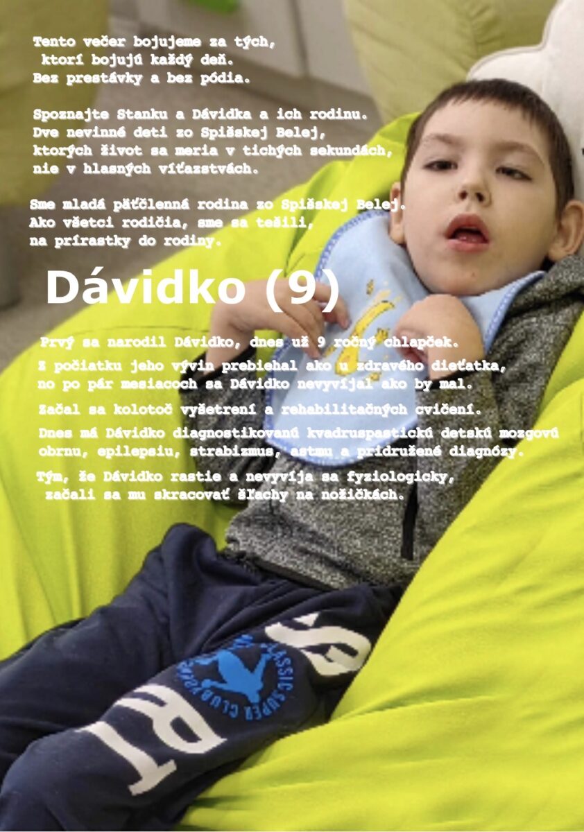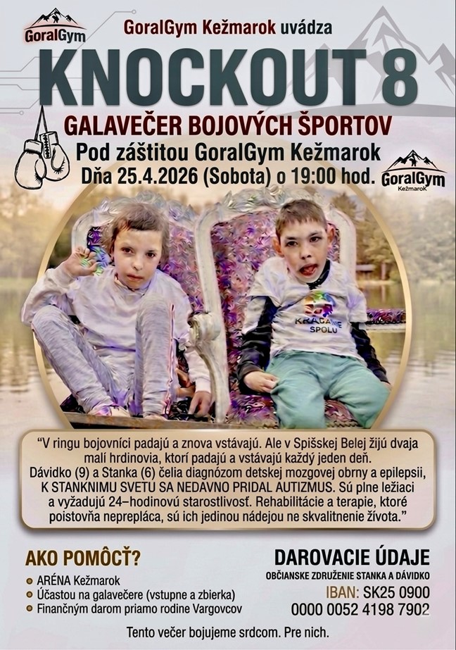 Teraz sú odkázaní na 24-hodinovú starostlivosť. Obaja sú plne ležiaci a plienkovaní, Majú diagnostikovanú detskú mozgovú obrnu a iné choroby. Aj Vy im môžete pomôcť zakúpením vstupenky na galavečer bojovníkov KNOCKOUT 8, ktorý sa uskutoční v sobotu 25. apríla 2026 alebo zbierkou na účet občianskeho združenia Stanka a Dávidko.