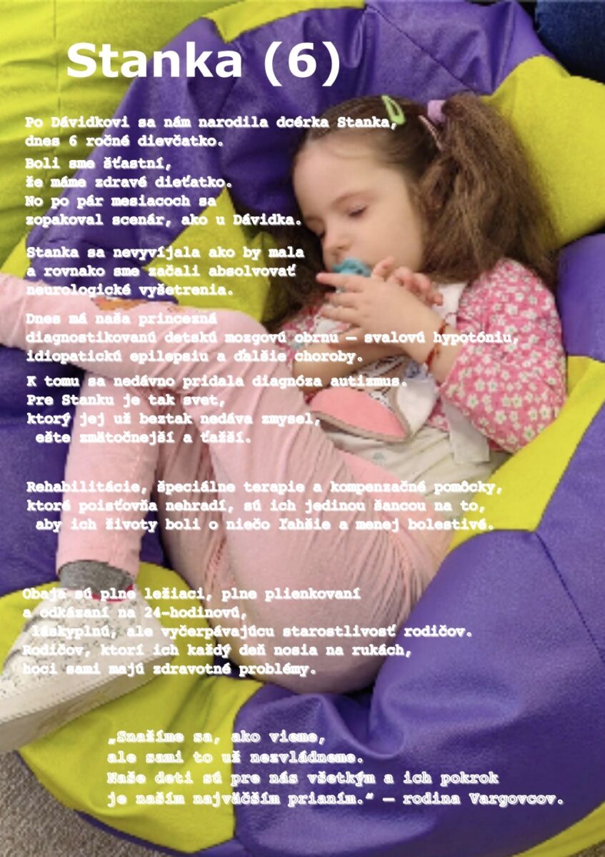 „Snažíme sa ako vieme, ale sami to už nezvládneme. Naše deti sú pre nás všetkým a ich pokrok je naším najväčším prianím,“ hovorí rodina Vargovcov. Dávidko a Stanka sa narodili zdraví, ale počas prvých mesiacov sa nevyvíjali tak, ako by mali.