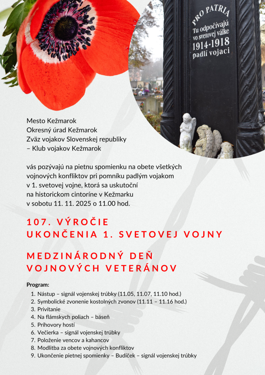 vás pozývajú na pietnu spomienku na obete všetkých vojnových konfliktov pri pomníku padlým vojakom v 1. svetovej vojne, ktorá sa uskutoční na Starom historickom cintoríne v Kežmarku v sobotu 11. 11. 2025 o 11.00 hod.
