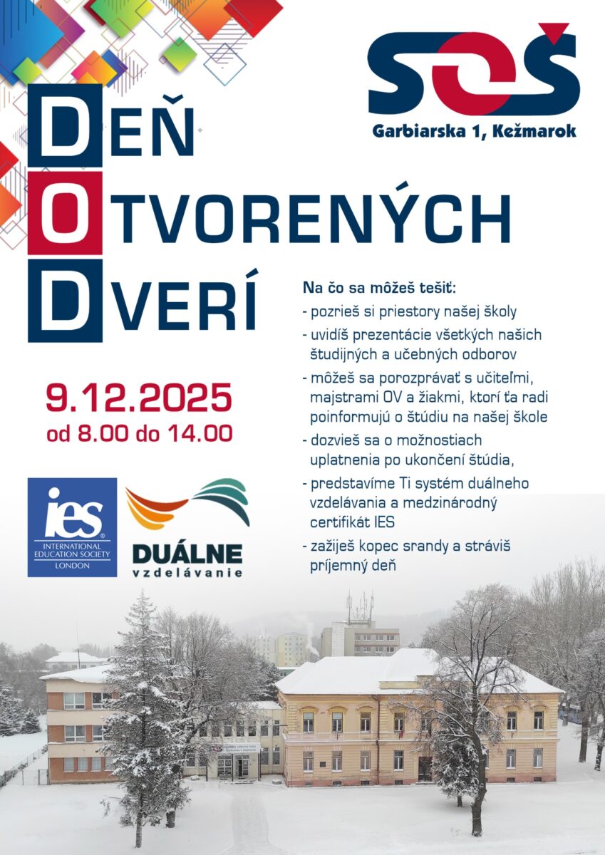 Milí priatelia, ak ste sa nestihli zúčastniť Burzy informácií stredných škôl, nezúfajte! Srdečne Vás pozývame v utorok 9. decembra 2025 od 8.00 do 13.00 hod. na náš Deň otvorených dverí, ktorý sa uskutoční v priestoroch teoretického vyučovania (vchod z ul. Dr. Alexandra).