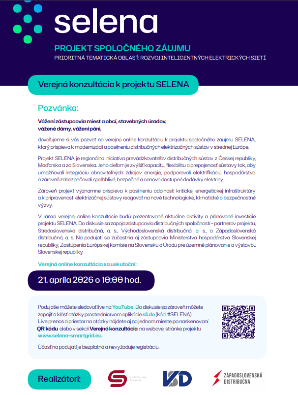 V rámci verejnej online konzultácie budú prezentované aktuálne aktivity a plánované investície projektuSELENA. Do diskusie sa zapoja zástupcovia distribučných spoločností – partnerov projektu, Stredoslovenská distribučná, a. s., Východoslovenská distribučná, a. s., a Západoslovenská distribučná, a. s. Na podujatí sa zúčastnia aj zástupcovia Ministerstva hospodárstva Slovenskej republiky, Zastúpenia Európskej komisie na Slovensku a Úradu pre územné plánovanie a výstavbu Slovenskej republiky.