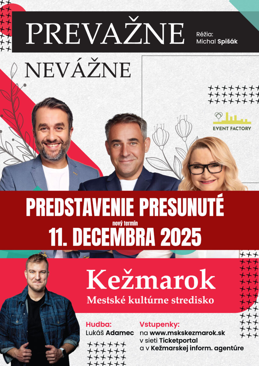 Podujatie PREVÁŽNE NEVÁŽNE, ktoré sa malo konať vo štvrtok 23. októbra 2025 v Mestskom kultúrnom stredisku sa pre rozhodnutie produkcie presúva na nový termín.