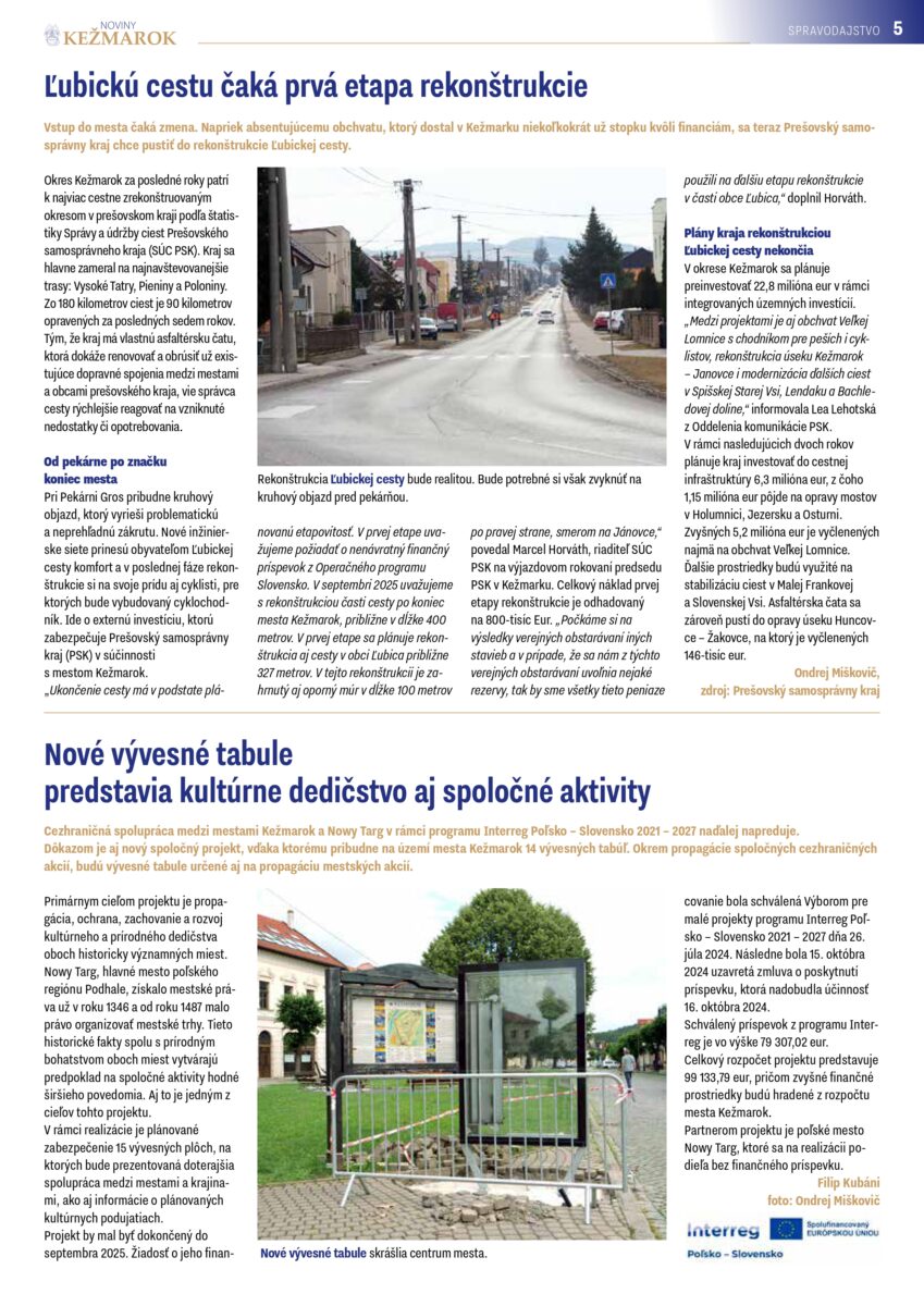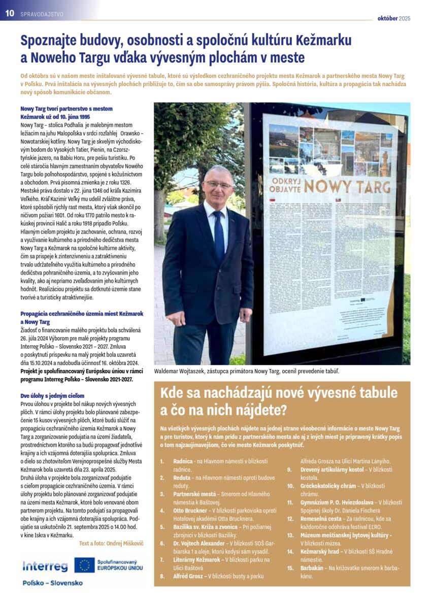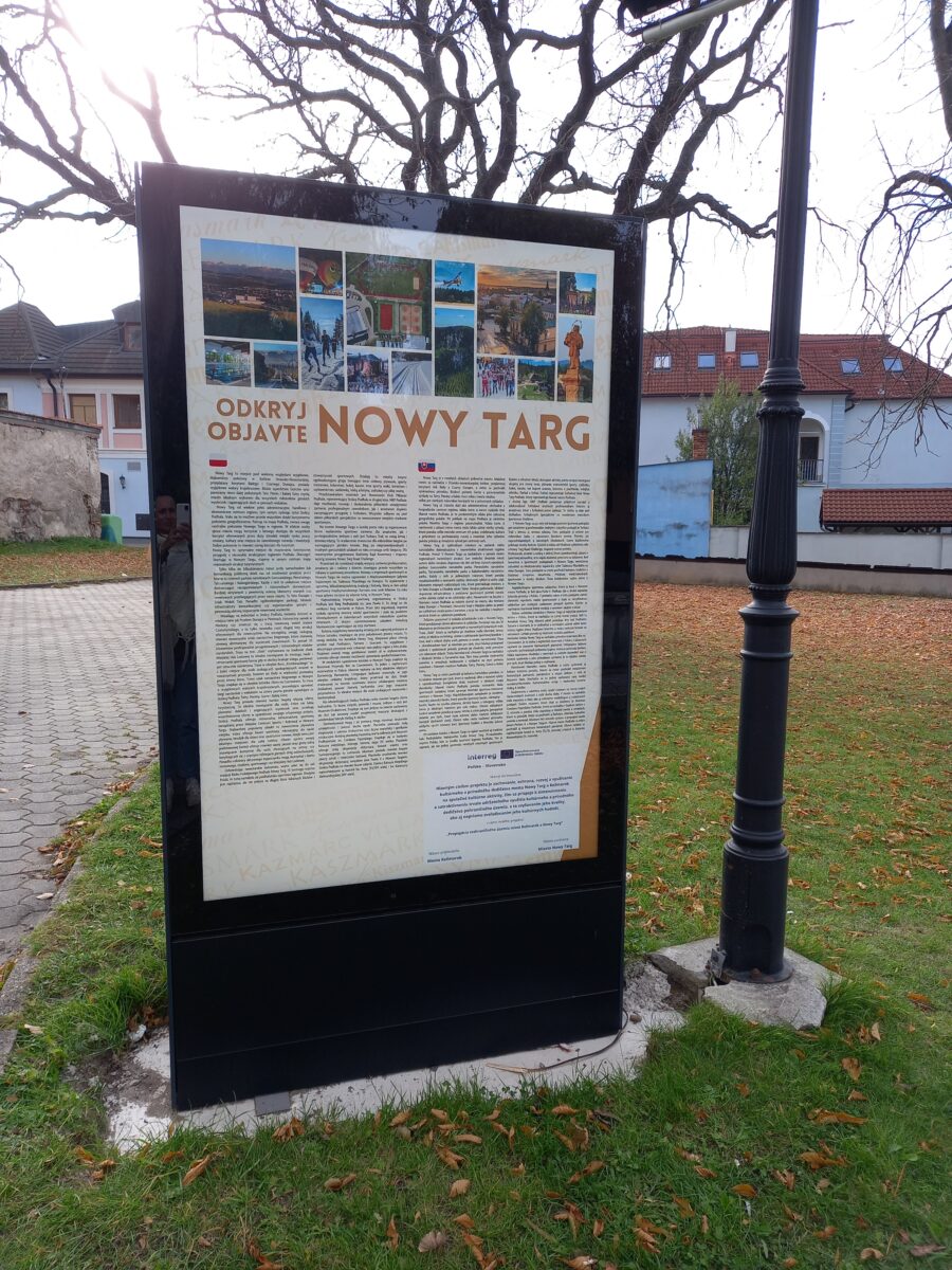 V rámci úlohy projektu je plánované zabezpečenie 15 ks vývesných plôch, ktoré budú slúžiť na propagáciu cezhraničného územia Kežmarok a Nowy Targ a zorganizovanie podujatia na území žiadateľa, prostredníctvom ktorého sa budú propagovať jednotlivé krajiny a ich vzájomná doterajšia spolupráca. Zmluva o dielo so zhotoviteľom Verejnoprospešné služby Mesta Kežmarok bola uzavretá dňa 23.04.2025.