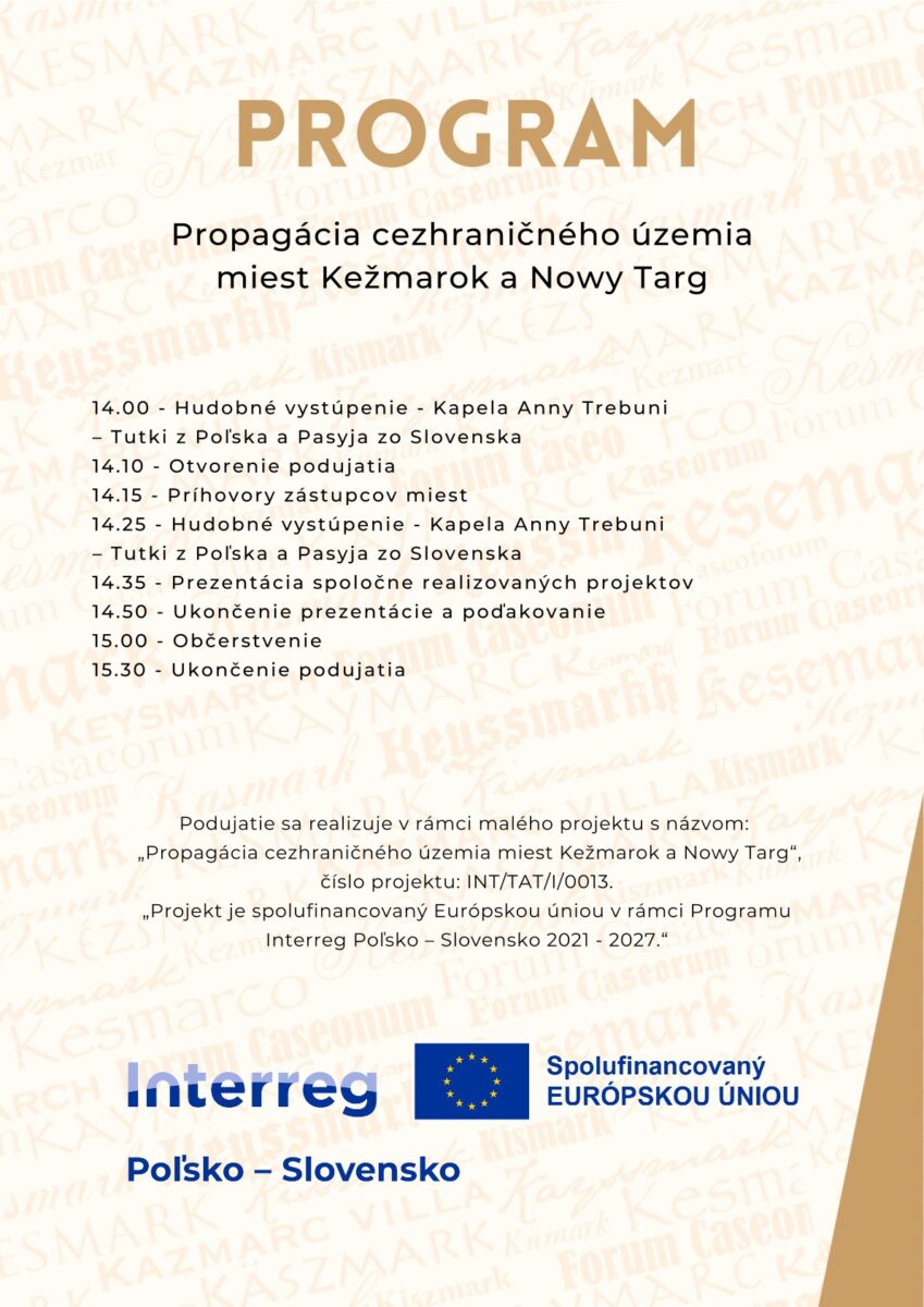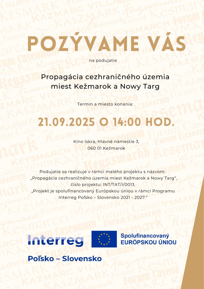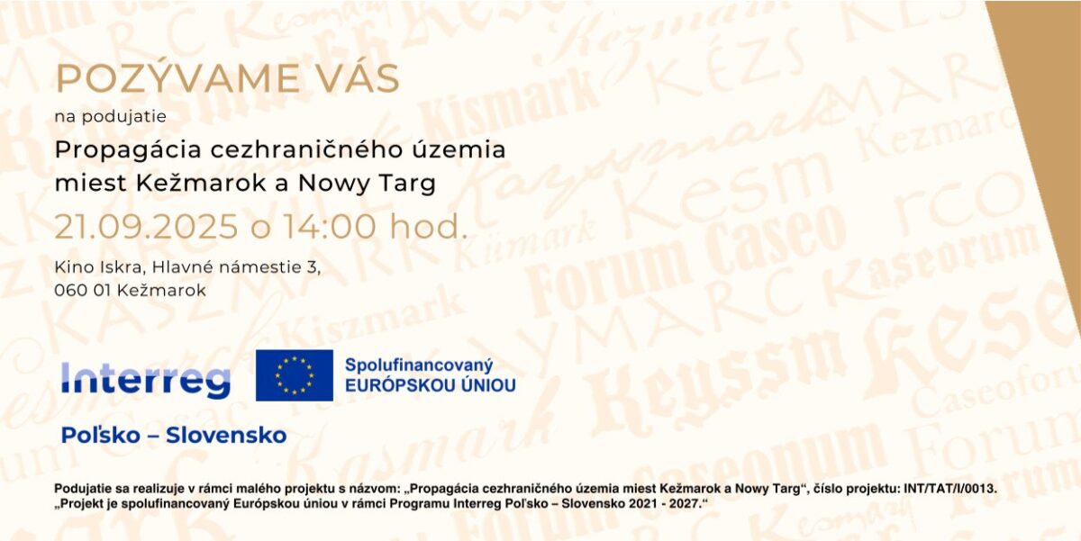 V rámci úlohy projektu je plánované zorganizovať podujatie na území mesta Kežmarok, ktoré bude venované obom partnerom projektu. Na tomto podujatí sa budú propagovať jednotlivé krajiny a ich vzájomná doterajšia spolupráca. Podujatie sa uskutoční dňa 21.09.2025 o 14:00 hod. v Kine Iskra v Kežmarku.